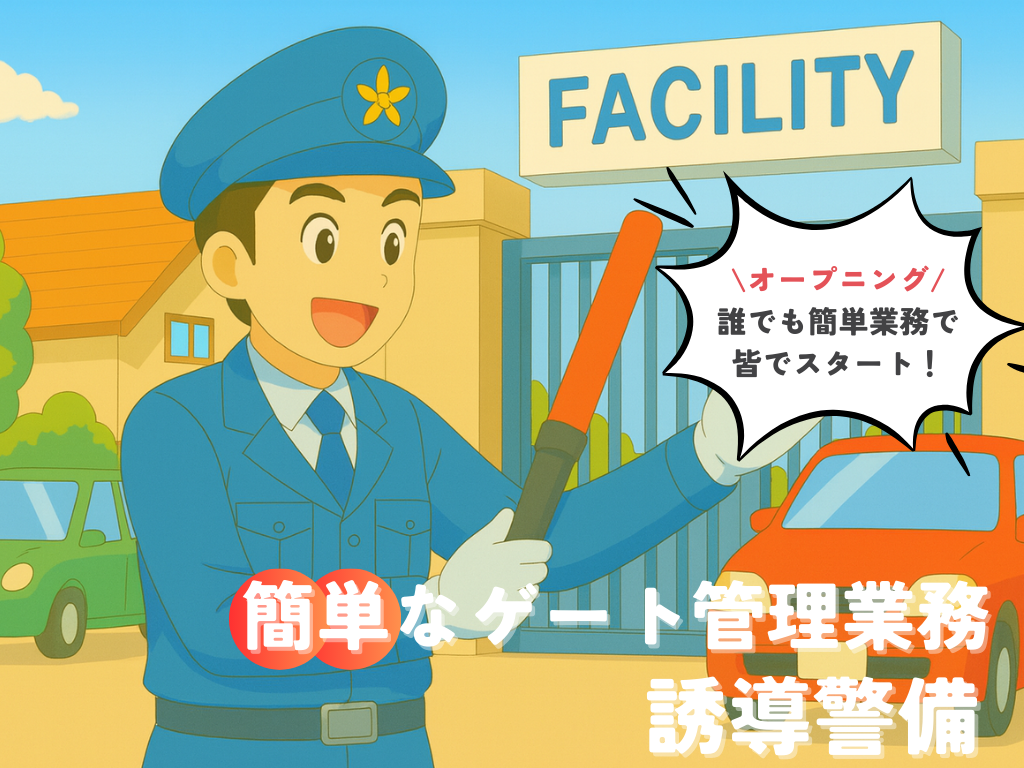 未経験歓迎!研修充実で安心!複数人体制で安心して勤務できます! 【オープニング募集!】 施設に出入りする 搬入車の安全誘導 をお任せします。 ・車両の死角をカバーし、歩行者や周辺車両への安全確保 ・スムーズに搬入・搬出できるようサポート ・単独業務ではなく、複数名体…